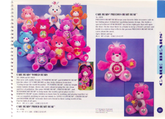 This is the final kenner catalog that features the Care Bears, and even though there is only one page of merchandise, that one page shows three different bears that were never produced. In addition to the 13 Proud Heart Bear that was sold, Harmony Bear and Funshine Bear were also suppose to be released, but never were. An all new bear named Precious Heart Bear was also created in 1991, who featured a “hidden” compartment in her tummy. This bear also, never made it in to stores.